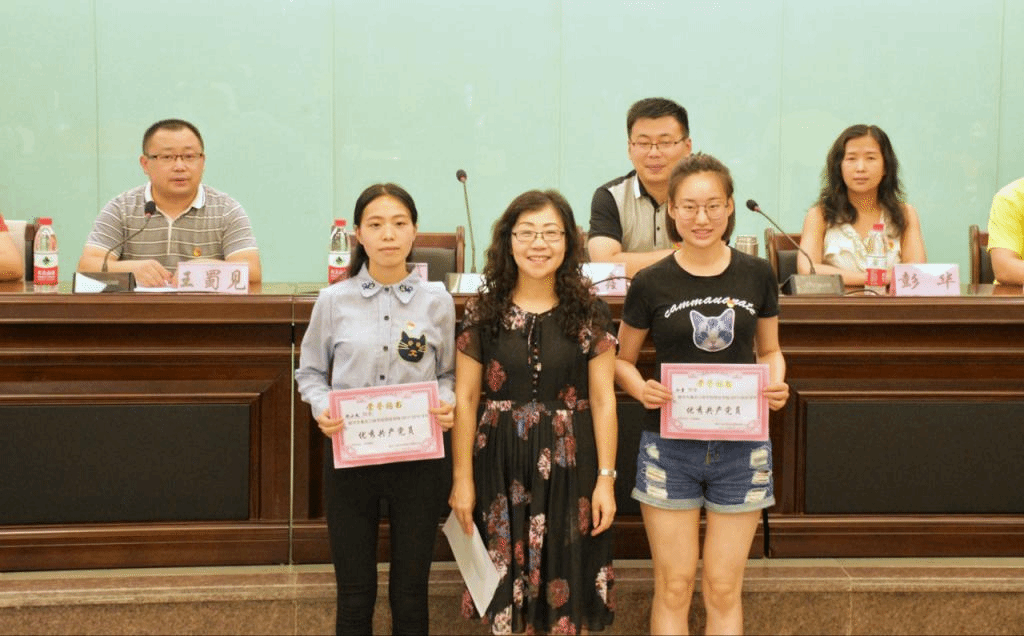 王蜀见宣读了学院表彰优秀党务工作者和优秀共产党员的文件,唐晓萍书记为学生优秀共产党员沈小凤、江雪和罗小铃三位同学颁发证书。