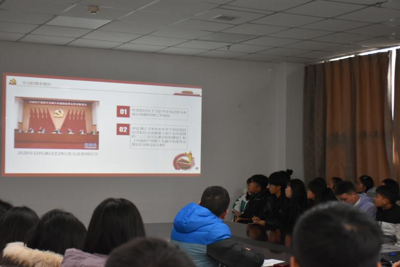 整个宣讲过程中,周书记介绍了全会的基本情况,紧紧围绕全面把握我国进入新发展阶段的重大意义、有利条件和重要特征,全面把握新发展阶段的目标任务,全面构建新发展格局的战略构想和重要着力点和坚持党的全面领导等内容展开宣讲何深入解读。告知党员同志们本次大会充分肯定党的十九届四中全会以来中央政治局的工作,提出了到二O三五年基本实现社会主义现代化远景目标及“十四五”时期经济社会发展的指导方针、主要目标、重点任务,为开启全面建设社会主义现代化国家新征程、向第二个百年奋斗目标进军提供了科学纲领和行动指南。并提醒同学们作为中共党员更是要主动积极学习会议精神,积极向其他同学传达。