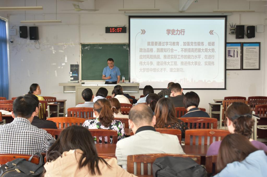 为深入学习贯彻习近平新时代中国特色社会主义思想,推动党史学习教育走深走实,太阳成集团官方网站教务处处长韩红宇于2021年5月27日在明辨1教401作党史学习教育宣讲报告,太阳成集团tyc33455全体教师参加报告会。