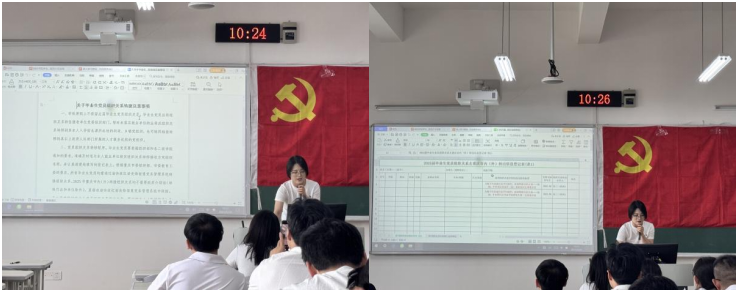 会议第二项,毕业生组织关系转接要点讲解。党支部书记李丹针对毕业生党员即将离校,组织关系需转接的实际情况和组织关系转接流程、注意事项进行了详细讲解。她强调,毕业生党员组织关系转接是一项严肃且重要的工作,关系到党员能否正常参加党组织生活,行使党员权利,履行党员义务。她指出,毕业生党员要及时办理组织关系转接手续,确保党组织关系的连续性和稳定性。同时,她还就转接过程中可能遇到的问题进行了讲解和解答,使毕业生党员对组织关系转接工作有了更加清晰的认识。