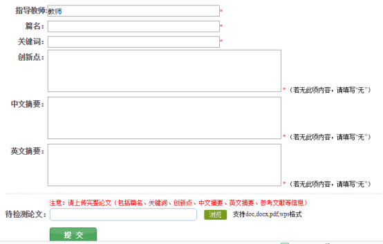 (4)登陆后,将篇名、关键词、创新点、中文摘要、英文摘要依次填写,并选中待检测的论文后,点击“提交”即完成 (指导教师不用选择,系统默认为教师)。