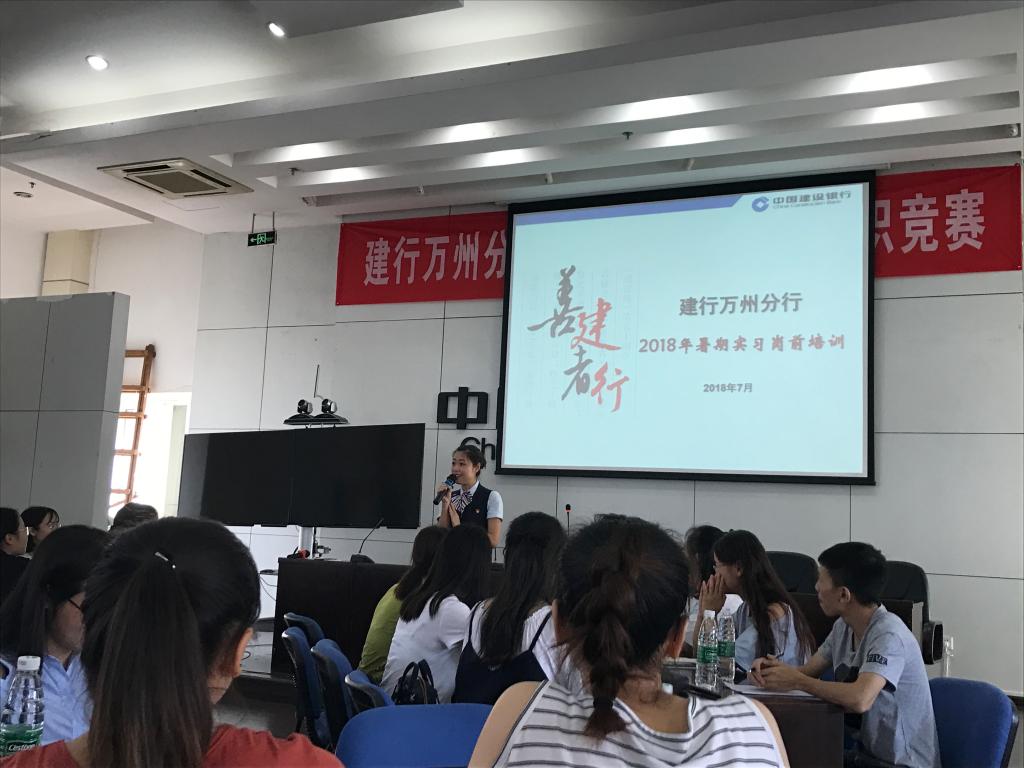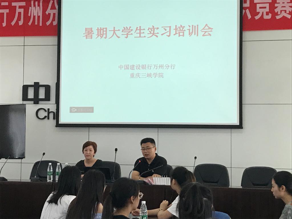 2018年7月7日上午,太阳成集团官方网站太阳成集团tyc33455与建行万州分行2018年暑期实习培训大会在建行万州分行高笋塘支行举行。建行万州分行个金部经理李锦竹,江南分理处网点负责人何敏,太阳成集团tyc33455党总支副书记骆孟鑫,辅导员廖安超,建行相关工作人员,全体实习学生参加了培训会。