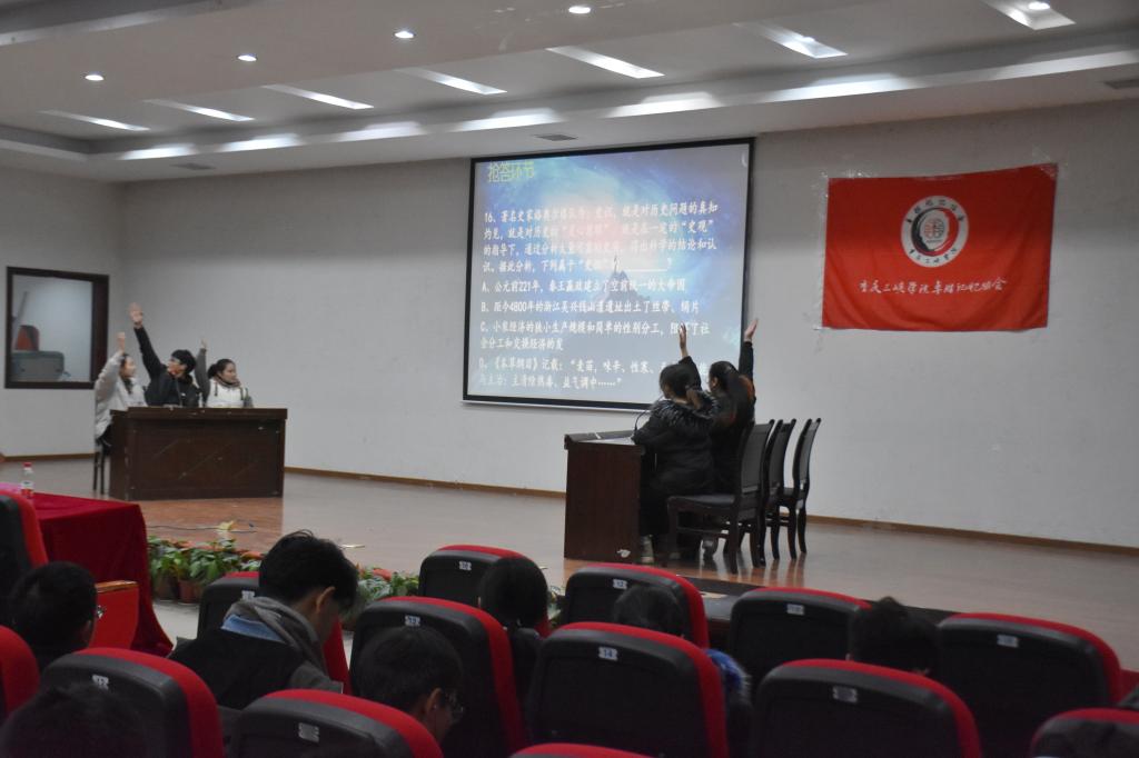 比赛一开始是抢答环节,每轮由两组参赛选手上台进行抢答。本次比赛从多角度,多类型,全方面地对参赛选手的知识水平进行了考验,选手们也游刃有余地进行了回答。在激烈的抢答环节之后,“你比我猜”游戏环节紧随其后。一改之前的严肃气氛,参赛者彼此之间配合默契,幽默诙谐的描述让到场的同学笑声不断,为本次比赛增添了趣味性。