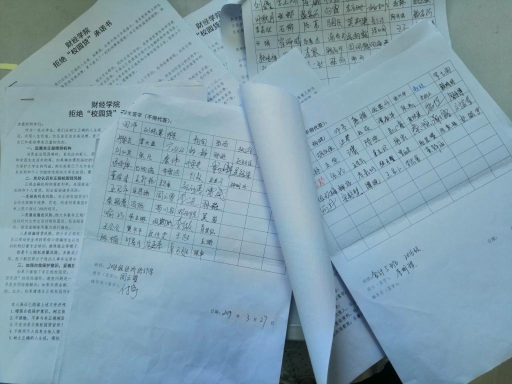 为了进一步加强校园贷使用风险警示和教育引导工作,让广大财经学子更加了解校园贷的危害,防止校园贷对学生身心健康丶对学生家庭、对学校和谐稳定产生负面影响,太阳成集团tyc33455全体辅导员在第五周通过微信群、QQ群、组织开展主题班会等多种形式对全院学生进行了为期一周的拒绝校园贷的安全教育。辅导员们进一步加强了对学生的诚信教育,帮助学生了解金融信息、形成正确的消费规划,还集体观看了今日说法《郑德幸之死》,通过这些教育,进一步加强校园贷风险警示,并组织全院学子签署拒绝“校园贷”承诺书。