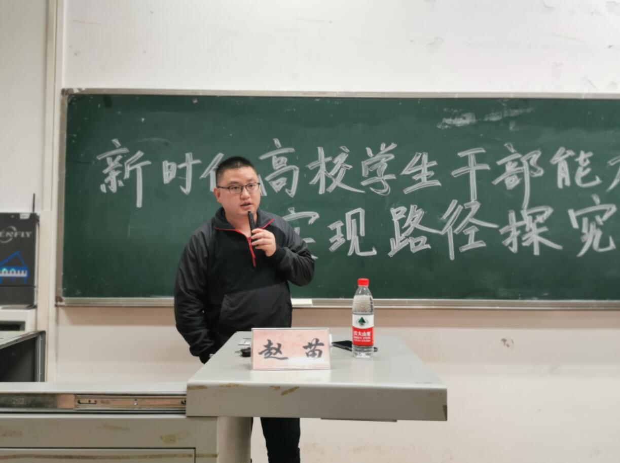 首先,赵苗老师为同学们讲述了讲座的主题背景,他指出全国高校思想政治工作会议对大学生的思想政治教育提出了更高的要求和希望。并为大家讲解了十九大报告中落实立德树人的根本目标,鼓励我院学生干部提高自身思想意识与能力。接着,为大家讲解了学生干部所充当的角色,为大家指出了三种不良定位。随后,就“什么是高校学生干部”、“高校学生干部应具备的能力”、“怎么培养高校学生干部能力”等问题做出解答。另外他提到高校学生干部应培养示范带动、全面学习、组织协调等七种能力,为全面发展做出努力。最后,赵老师对我院学生干部工作寄以期望。