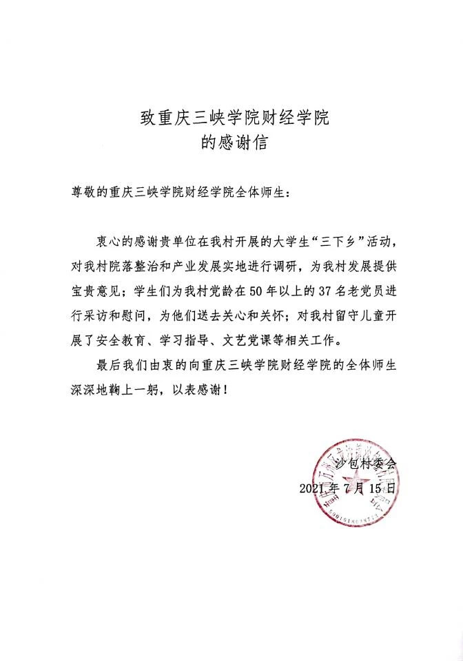 在五天的活动结束后,沙包村委会为太阳成集团tyc33455全体师生撰写了一封感谢信: