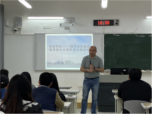 学院党总支副书记何兴权结合近期访企拓岗经历,分别从就业市场、求职本领、就业观念、求职礼仪等方面为同学们带来一堂生动实用的求职秘籍。何书记指出:目前就业市场整体不容乐观,东西部发展不协调、部分行业颓势依然,鉴于此,同学们更应该增强本领、转变观念、抢抓机遇,尽早实现自身高质量就业。同时,何书记指出作为新时代毕业生,要提升自身人文素养,强化礼仪培养,留下出入职场的良好“第一印象”。