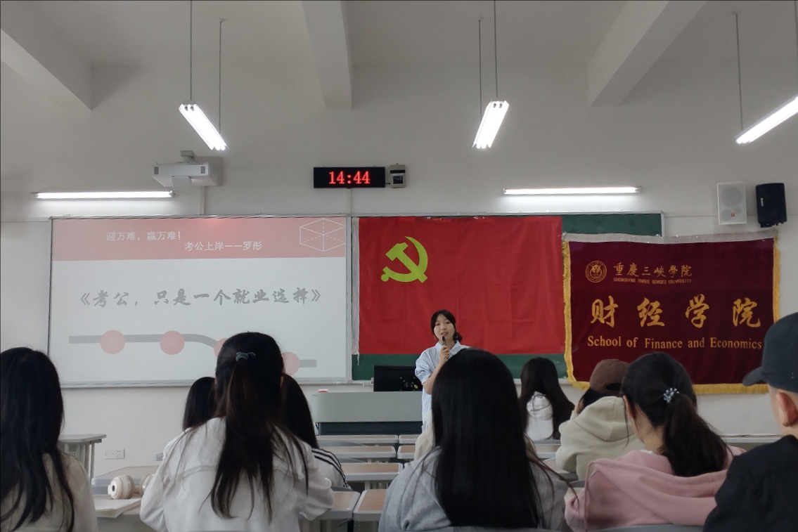随后,2021级罗彤学姐带来了她“迎万难,赢万难”的考公经验分享。罗彤学姐从选岗、笔试、面试整个流程进行讲解,结合自身面试经历,鼓励同学们在考公之路上要敢于秀出自信、展现自我,不放过任何一个机会,自信地去争取理想岗位。同时,罗彤学姐也理性地指出,考公只是众多就业选择之一,同学们更应明确自身追求,无论是渴望学历提升,还是向往理想工作岗位,坚守本心、做好自己才是关键。
