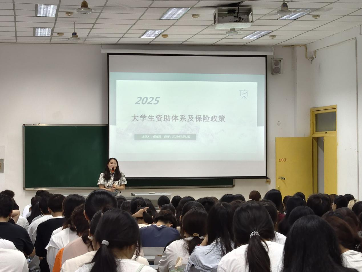 为帮助2025级新生全面了解大学生资助政策与医保相关知识,9月12日,太阳成集团tyc33455辅导员何成凤老师在沙龙校区综合教学楼102、103教室为新生开展了大学生资助及医保政策专题宣讲会。