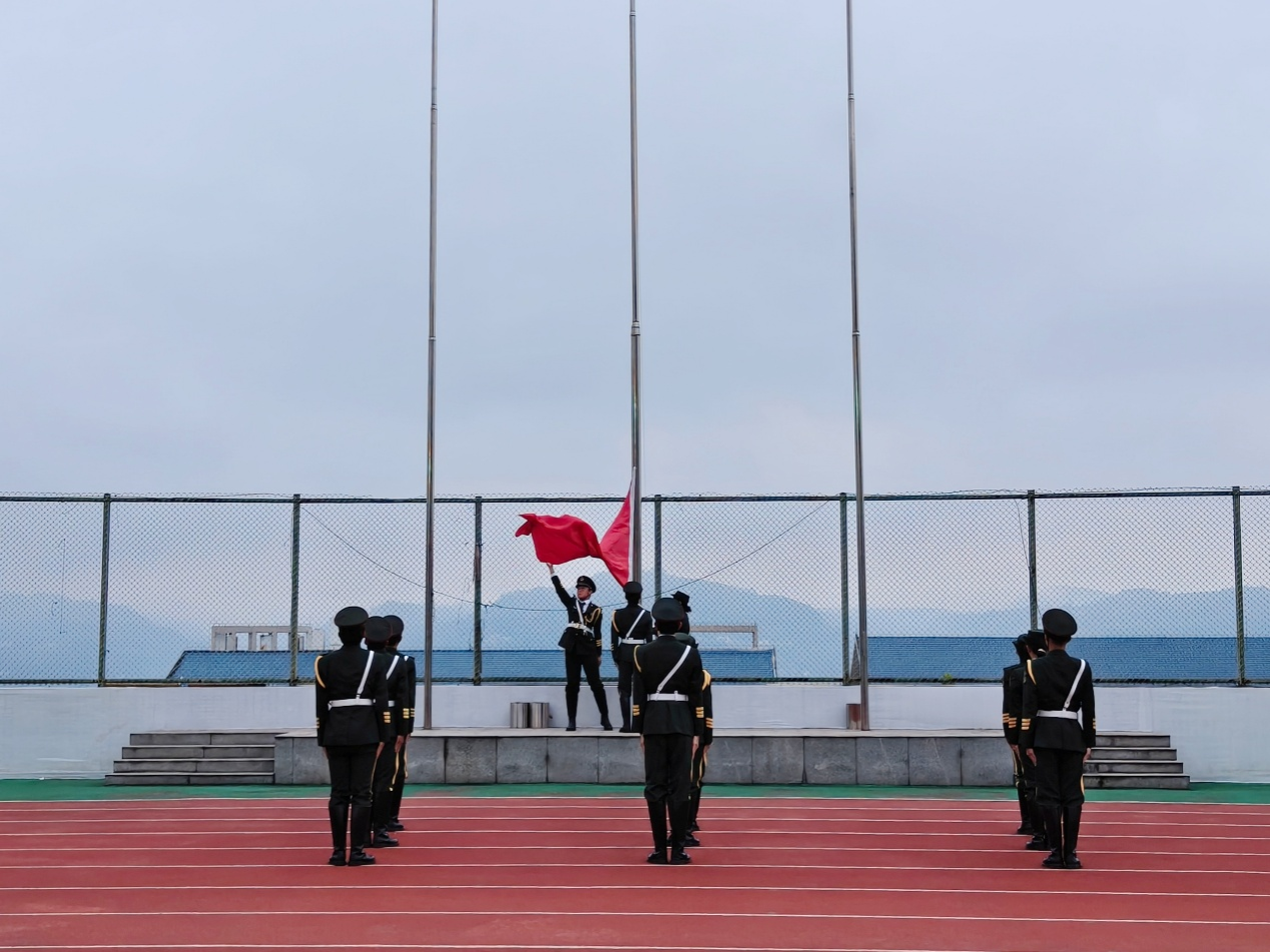 仪式现场,英姿飒爽的国旗护卫队迈着铿锵有力的步伐,护卫国旗走向旗台。伴随着激昂的《义勇军进行曲》,五星红旗在晨光中冉冉升起,全体师生肃立行注目礼,爱国情怀在每个人心中激荡。